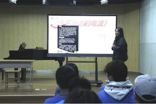 讲堂上,刘佳仪老师以《守护》《永不消逝的电波》《觉醒年代》等优秀话剧作品为例,从戏剧的含义、导赏、赏析,以及教师现场的演绎,引导学生了解到作品的丰富内容与内涵,从话剧中动情动人的故事细节领悟革命征程精神。这既是一堂精彩的艺术赏析课,也是一堂生动的爱国主义教育课。