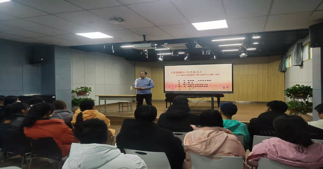 为弘扬红色文化,唱响红色歌曲,激励大学生爱国情怀,10月26日下午,我校美育部在明德堂小剧场开展题为“党恩暖心,以艺化人”——现代民族歌剧《野火春风斗古城》赏析的美育讲堂。