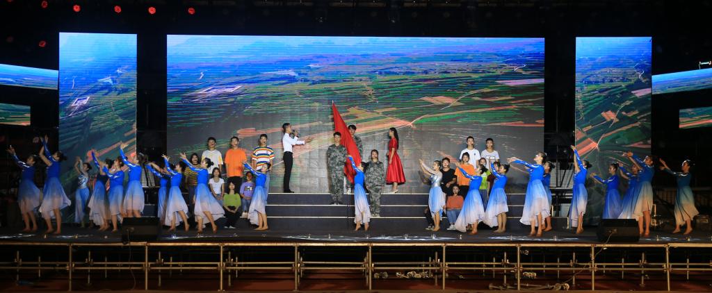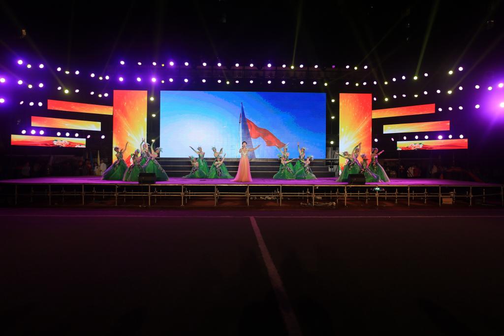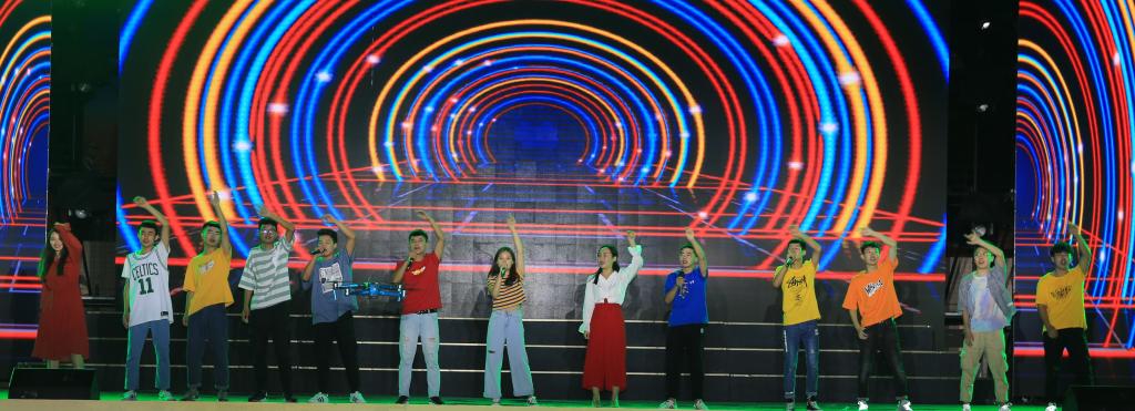 伴随着优美动听的歌声,晚会在《青春梦·爱国情》动感的旋律、整齐的舞步中拉开序幕。具有浓郁黄土气息的民族舞蹈《心中的东方红》瞬间将热情奔放带入全场,今年刚入校的新同学、新教师用歌曲串烧《致·青春》共同演绎了精彩绝伦的青春之歌;情景剧《信念》声情并茂、激励人心的表演将观众的思绪带到了遥远的记忆中,让我们重温了中华人民共和国国歌的诞生历程;音画《我的祖国》更是表达了拳拳赤子对祖国母亲的眷恋之情。炫酷的街舞表演《青春ABC》激情洋溢、活力四射,小品《民工父亲》的表演质朴、深情,赢得台下阵阵掌声。我院特邀咸阳青年歌唱家张戈、雷刚、徐佳在台上台下齐声高歌《我和我的祖国》,气势恢宏的全场合唱,唱出了每一位中华儿女发自内心对祖国母亲最深沉地告白。与此同时一面巨幅的五星红旗缓缓穿梭在观众席,经过主席台时,台上台下连成一体,数千面红旗挥舞、荧光棒、手机灯闪耀,汇成了红色的海洋、歌的海洋。