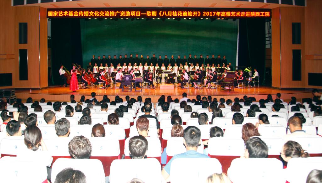 6月14日晚,2017高雅艺术进校园——大型原创民族歌剧《八月桂花遍地开》走进陕西工院专场演出在我院明德堂隆重上演,湖北省歌剧舞剧院为我院师生带来了一场激动人心的民族歌剧盛宴,使我们近距离感受了民族歌剧艺术的魅力。党委书记崔岩,院长张晓云,党委副书记王天哲,党委副书记、副院长刘永亮,副院长杨卫军,纪委书记康强,各处级单位负责人、教师代表及1200余名学生共同观看了演出。