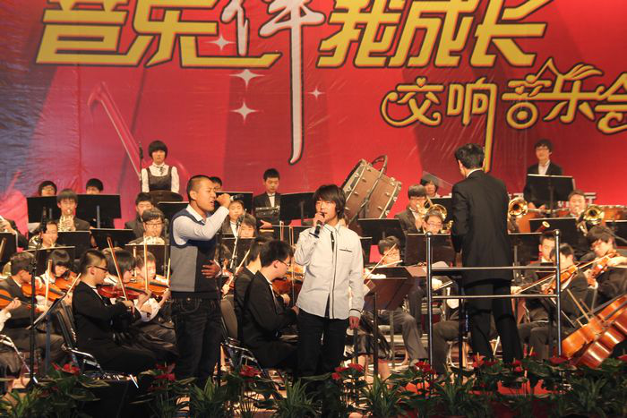 音乐会在欢快的管弦乐法兰多尔舞曲《阿莱城的姑娘》中拉开帷幕,随着优美旋律的响起,同学们的思绪也随之进入华美的音乐殿堂。弦乐合奏《天空之城》曲调优美、动人心弦,把现场观众带入了唯美的动漫世界;管乐合奏《轻骑兵序曲》及圆舞曲旋律激昂、催人奋进,让同学们领略了不同风格音乐作品的艺术魅力。演出过程中,乐团指挥罗琦老师还结合乐器演奏为现场观众简要介绍了交响乐团的相关知识。《山丹丹开花红艳艳》、《北京喜讯到边塞》等中国曲目的精彩演奏以及我院学生冯业博、邢路和西安铁一中学同学们合作演出《菊花台》将现场的气氛推向了高潮。随后,我院艺术教育中心付胜利老师指挥演奏的《拉德斯基进行曲》把音乐会推向一个新的高潮。最后,交响音乐会在全场师生雷鸣般的掌声中,落下帷幕。西安铁一中交响乐团精湛的演奏技术、高超的音乐水平,获得了我院广大师生的一致好评,现场掌声经久不息。